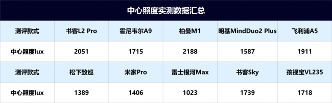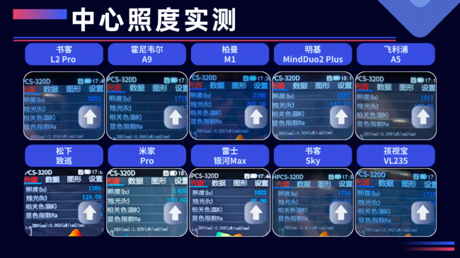 先看十款台灯的实测光谱仪读数,每款的中心照度都能直接看到: