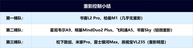 霍尼韦尔A9、明基MindDuo2 Plus、飞利浦A5和书客Sky属于轻微重影级别。霍尼韦尔、明基和飞利浦都是侧发光,光线扩散均匀,笔尖下方有轻微重影但颜色很淡,不影响书写视线。书客Sky在百元价位表现突出,虽然重影比L2 Pro明显一点点,但依然属于轻微级别。