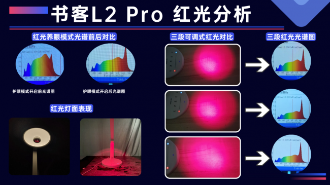 书客L2 Pro的蓝光压到0.4,是十款里面最低的。从光谱图能明显看到,它在415-455nm区域的能量很低,曲线平滑。技术路线上采用的是紫光激发,能从源头减少有害蓝光产生。而且在红光方面很突出,搭载RRT2.0红光养眼技术,光谱图上670-700nm波段非常饱满,明显比其他款鼓起来一块。更特别的是,它的红光支持三段可调式设计,因为比较特别所以我还专门做个图分析了一下: