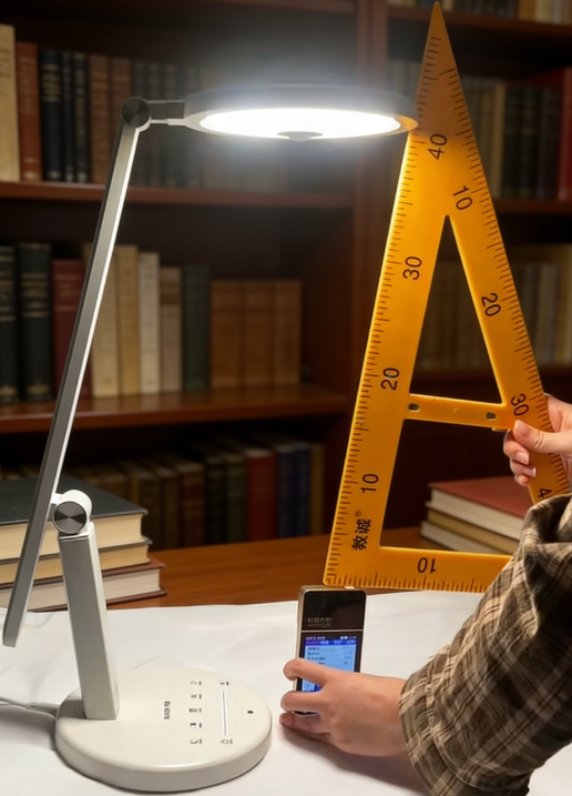 测试距离:统一把灯头调到离桌面40厘米高,这是国标测试标准,也是大多数孩子写作业时的大概高度。