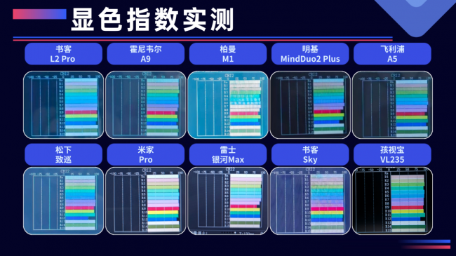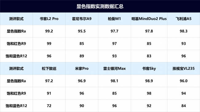 实测下来,显色全面型的有书客L2 Pro、书客Sky和飞利浦A5,书客两款的红蓝还原都很准,飞利浦A5也不错。