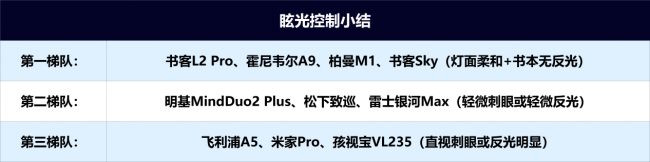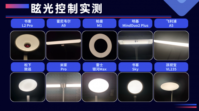 从图上能直观看到,书客L2 Pro、霍尼韦尔A9、柏曼M1、书客Sky这四款的灯面看起来柔和均匀,没有刺眼感。明基MindDuo2 Plus、松下致巡、雷士银河Max这三款直视时有轻微刺眼。飞利浦A5、米家Pro、孩视宝VL235这三款直视刺眼感比较明显。
