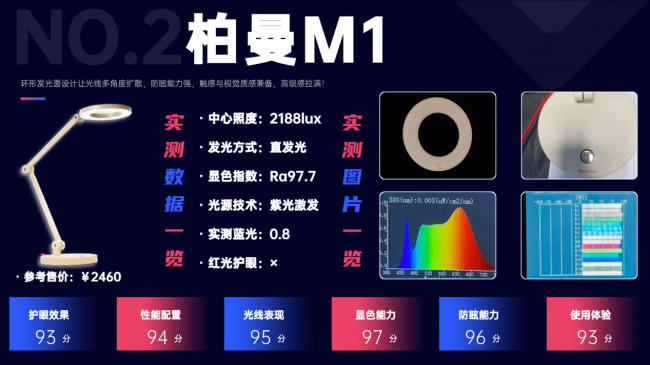 第二类是综合Ra高但单项偏科型。柏曼M1实测显色指数Ra97.7,R9达97、R12也有93,红色表现非常好,蓝色也不弱,整体很均衡,放在这一档其实有点委屈它了。雷士的Ra有98.1,R12也有96,但R9只有85,红色还原偏弱。明基的Ra97.8,但R9和R12都没上90。松下的Ra97.2,R9有91还可以,但R12只有72,是十款里面最低的。