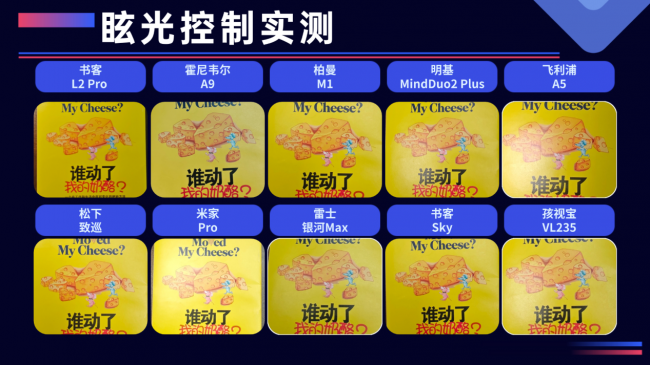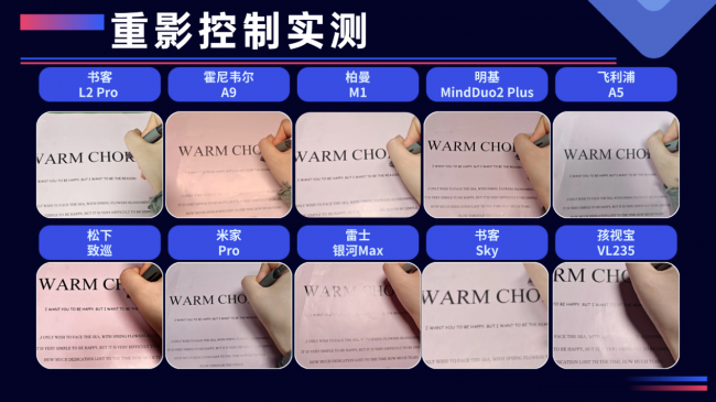 从图上能看到,书客L2 Pro、霍尼韦尔A9、柏曼M1、书客Sky这四款的书页非常干净,几乎没有反光。明基MindDuo2 Plus和松下致巡在中间区域有轻微反光,雷士银河Max也有轻微反光。飞利浦A5中间有比较明显的反光,米家Pro和孩视宝VL235的反光最明显,书页上能看到大块光斑。