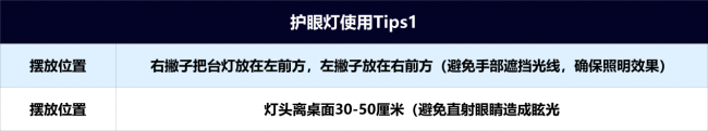 第一,摆放位置要对。 灯头离桌面30-50厘米,确保灯头不直射眼睛。同时右撇子把台灯放在左前方,左撇子放在右前方,避免写字时手部遮挡光线。