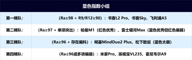 第三类是均衡但Ra略低型。米家Pro的Ra96.9不算高,但R9有96、R12有90,红蓝还原反而比一些Ra更高的款更均衡,这一点挺意外的。