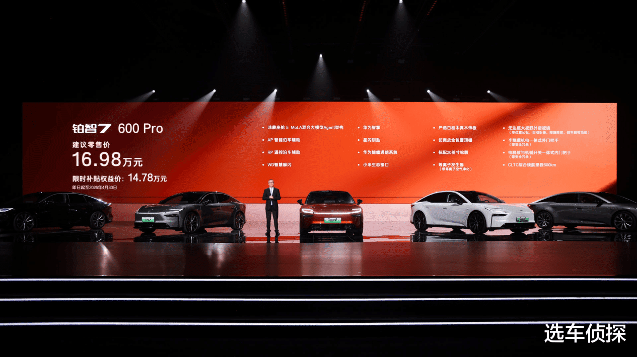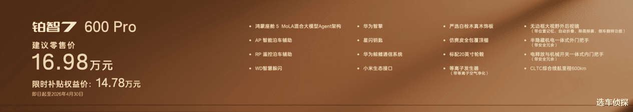 铂智7600Pro版,版本基础配置不基础,入门即豪华,限时补贴权益价14.78万。同价位最大尺寸旗舰轿车,标配内置MoLA架构的鸿蒙座舱5,具备类人化智能交互,搭载带智能泊车的L2级智驾、华为智擎、尊界同款星闪钥匙、纯天然实木内饰和座椅通风加热、20寸轮毂等超15项豪华配置。D级车的尺寸和享受,B级车的价位,加上丰田全球品质兜底,性价比断层领先。
