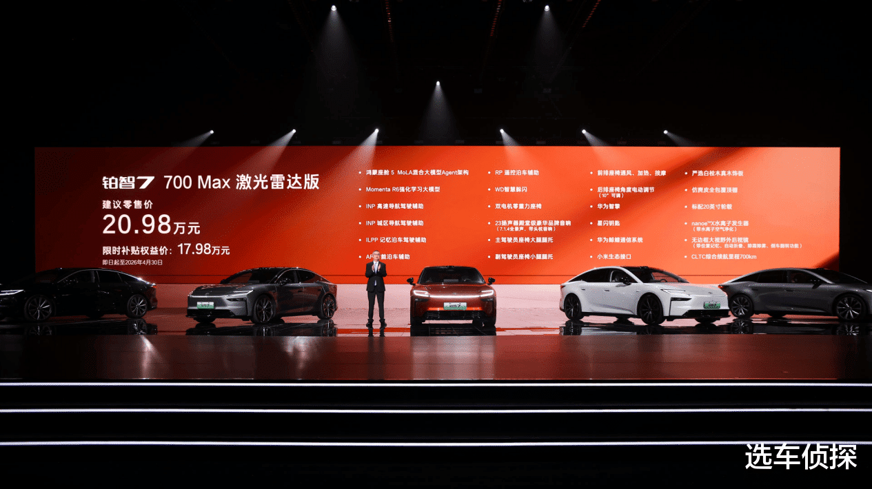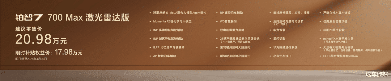 700km续航提供三个版本,全部标配双电机零重力座椅、主驾大腿托、后排智能触控面板和23扬声器等超11项配置,过往30万以上车型的豪华舒适配置,全部下放到20万以下。700Max版聚焦长续航与高阶舒适,限时补贴权益价16.58万,加5000元即可选装行业最低价的双腔空悬,拥有17万级双腔空悬纯电家轿第一车。700Max激光雷达版限时补贴权益价17.48万,增加Momenta R6大模型高阶智驾辅助。再加5000元选装基金即可升级至700Max激光雷达双腔空悬版,一次性配齐华为鸿蒙座舱5、Momenta R6大模型激光雷达智驾、双腔空悬等超豪华三件套,20万内唯一。