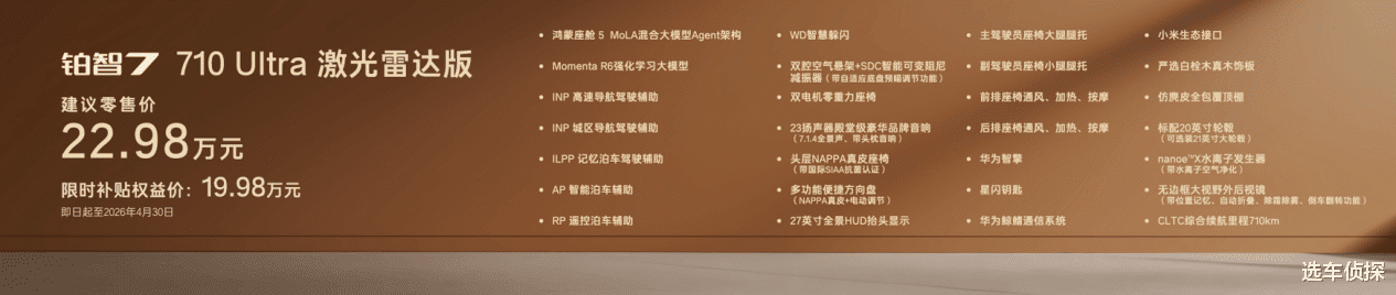 顶配710 Ultra激光雷达版限时补贴权益价19.98万,不仅集齐鸿蒙座舱和激光雷达智驾、双腔空悬、零重力座椅、23扬声器等全豪华配置,实现豪华“一步到位”,还把给足情绪价值的27英寸全景HUD抬头显示、NAPPA真皮方向盘和座椅、智能香氛系统等统统安排,是同价位最超值的选择。