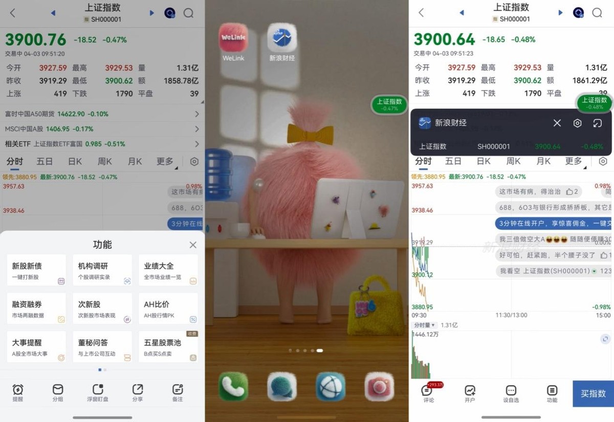 以前炒股我是真难受,一边在刷抖音正起劲呢,一边还惦记着股价走势,只好切回新浪财经瞅一眼,再切回浏览器,还害怕错过关键交易点。现在用鸿蒙版新浪财经,在行情页功能区点一下“浮窗盯盘”,屏幕侧边就会弹出一个小悬浮球,牢牢置顶显示我的自选股涨跌情况;点一下这个闪控球,还能立刻跳转到行情页面,看行情+做买卖一步到位!不止鸿蒙版新浪财经,京东金融、同花顺等理财类App也都支持闪控球功能。