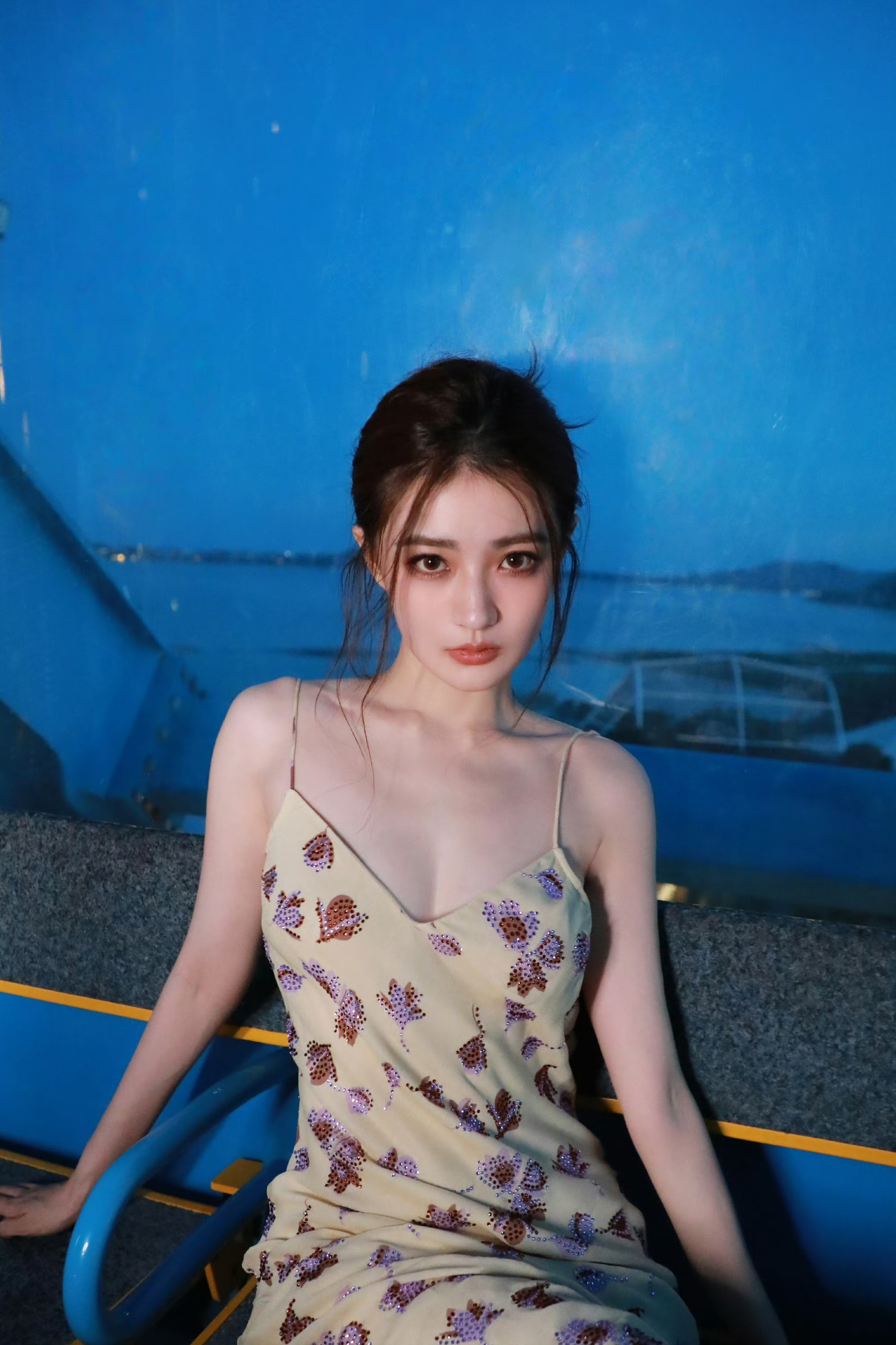 换了件浅黄碎花吊带裙,细肩带垂落肩头,V领恰好勾勒出锁骨的精致弧度,裙身垂坠感让身形线条愈发修长。裙身缀着的碎钻花纹在微光里闪烁,肌肤尽显莹润透亮。