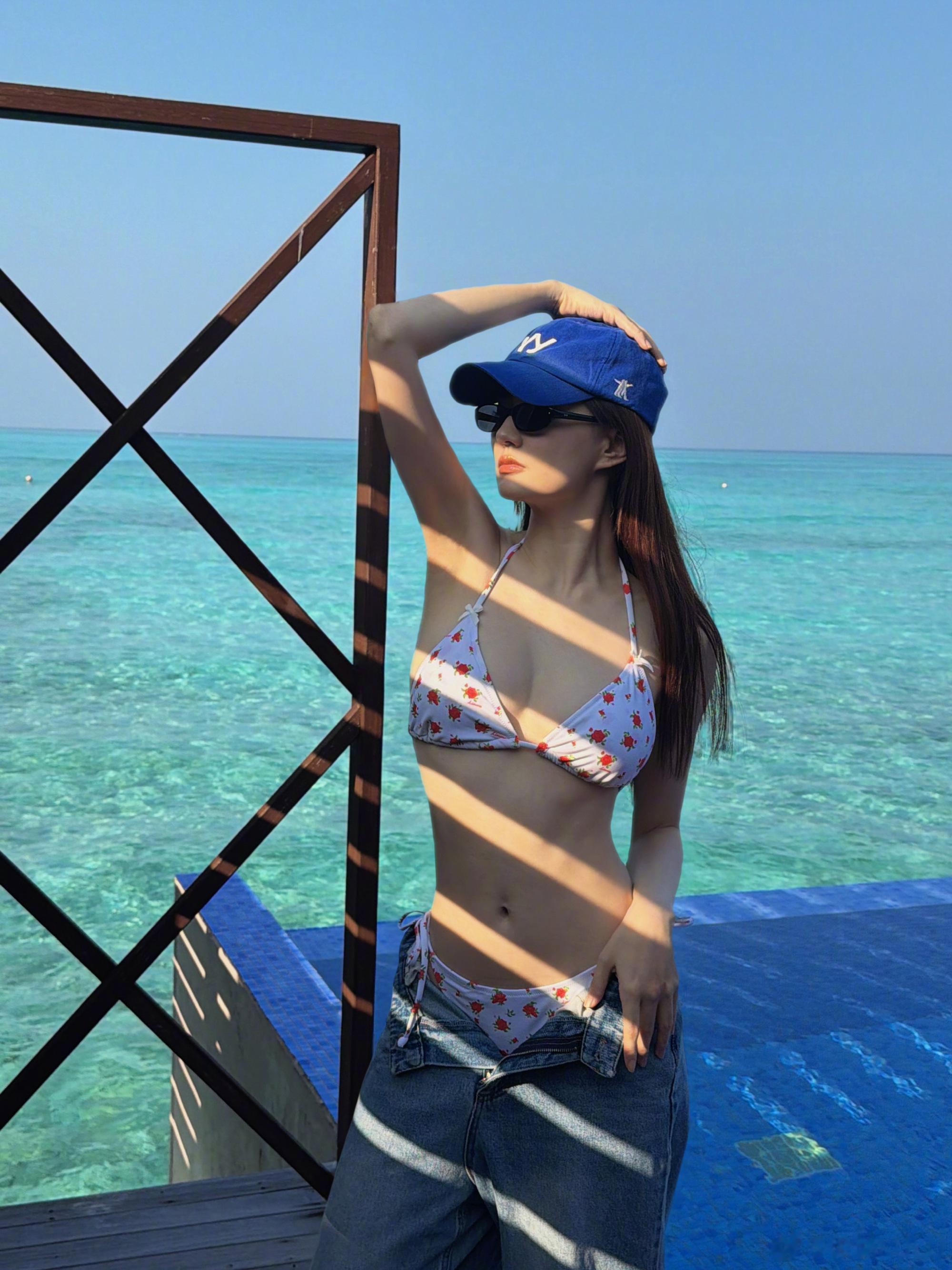 蓝色碎花比基尼搭配宽松牛仔裤,棒球帽与墨镜添了几分随性酷感。比基尼裹着饱满肩颈,平坦小腹上的马甲线若隐若现,半褪的牛仔裤凸显出双腿的笔直,每一处线条都透着健康明媚的少女张力。
