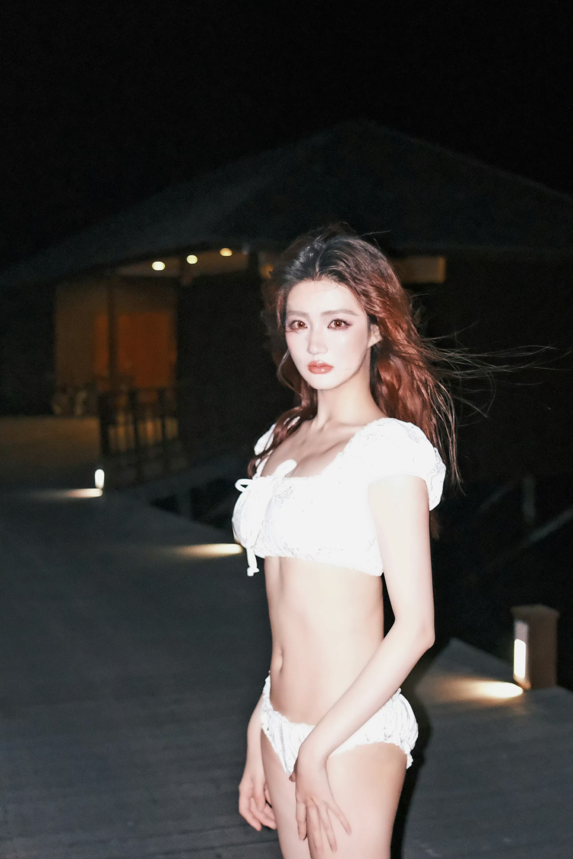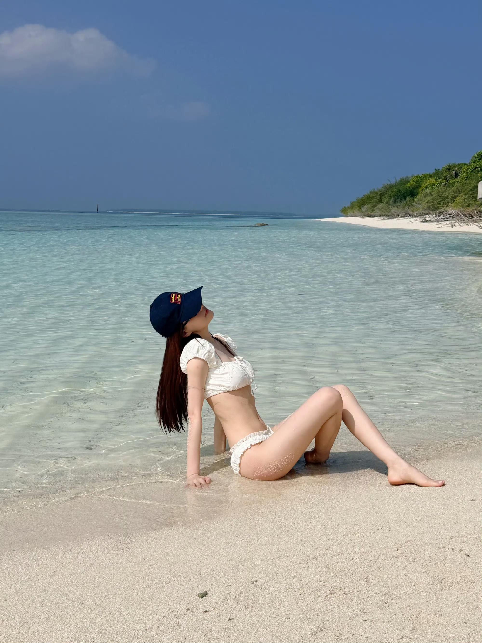 徐璐身着同款白色蕾丝分体泳装站在浅浪里,方领泡泡袖衬得肩颈线条愈发纤细,胸前系带随着海风轻晃,细碎蕾丝顺着腰肢蔓延,完美描摹出紧致平坦的小腹与流畅腰臀线。