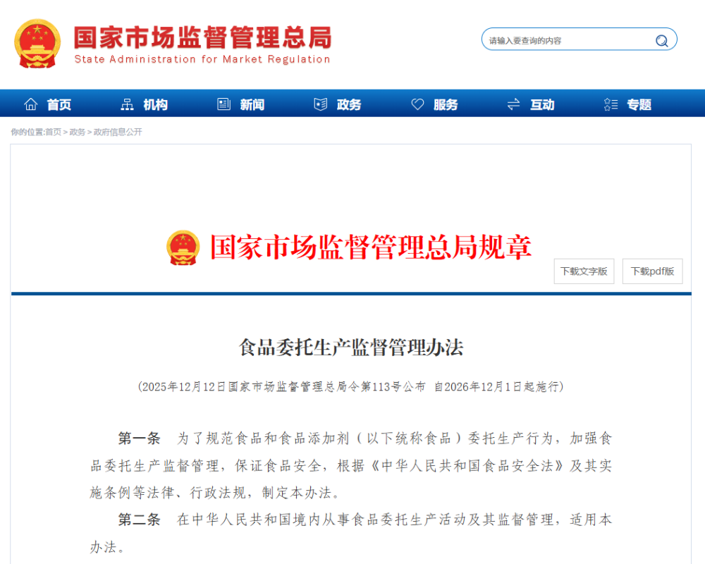 12 月 29 日,市场监管总局公布《食品委托生产监督管理办法》,进一步明确食品委托和生产双方责任义务,该管理办法自 2026 年 12 月 1 日起施行。办法的出台将加强食品委托生产领域的监管,规范食品生产经营行为,保障食品安全,维护消费者合法权益。