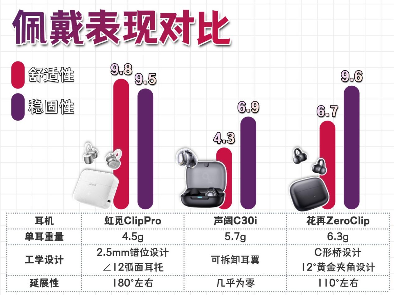 虹觅Clip Pro:虹觅Clip Pro这款耳夹戴着特别舒服,几乎感觉不到存在,错位设计和弧面耳托让它牢牢挂在耳朵上,运动也不会掉。音质是它最大的亮点,双磁喇叭和气旋腔体组合让声音特别饱满,低音有劲,人声清晰,听着很过瘾。还有虹觅自研的防漏音模式,在公共场合用不怕打扰别人。通话方面有四麦克风降噪,对方听得清楚。总的来说,它把舒适、音质、隐私保护都做得很好,在三百块价位里非常能打。