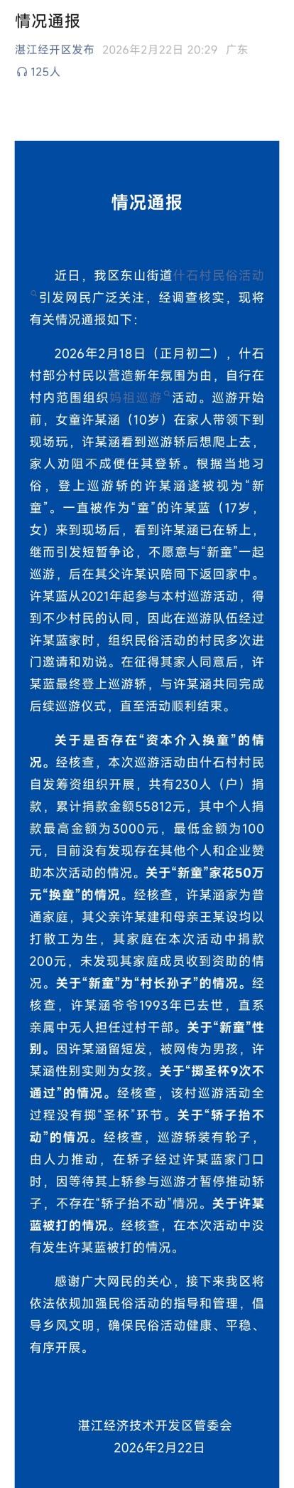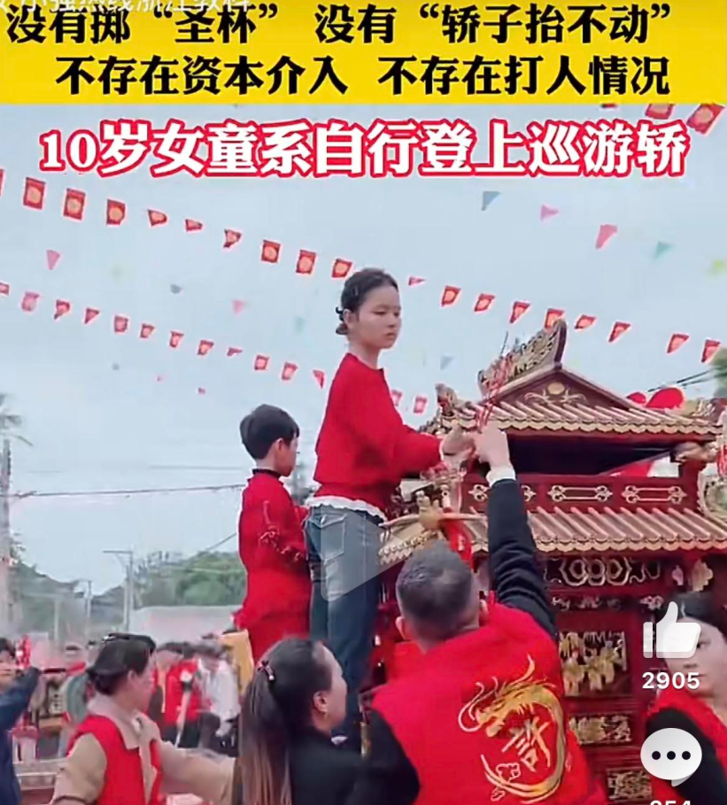 2026年2月18日大年初二,广东湛江经开区东山街道拾石村在妈祖巡游活动中发生“换童”争议。我最早刷到的视频说得有鼻子有眼:原来靠掷圣杯当选的女童,被另一家人出资50万强行换成了自己家孩子。结果新童连掷8次都没有通过圣杯,几个大汉抬轿子,轿子竟然纹丝不动。于是主办方没办法,转而去请原来的乩童,一切问题迎刃而解。