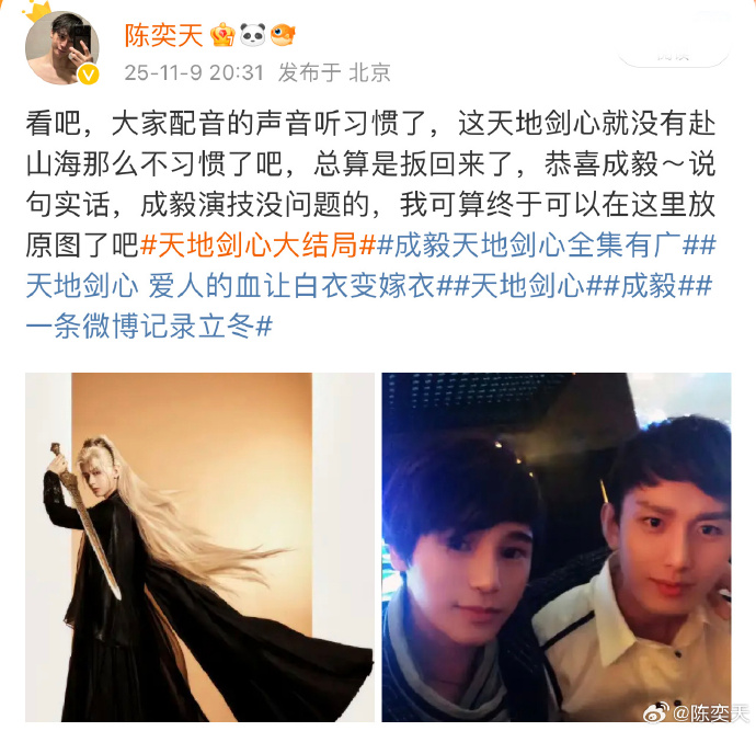 北京时间2025年11月9日,陈奕天发博“看吧,大家配音的声音听习惯了,这天地剑心就没有赴山海那么不习惯了吧,总算是扳回来了,恭喜成毅~说句实话,成毅演技没问题的,我可算终于可以在这里放原图了吧#天地剑心大结局##成毅天地剑心全集有广##天地剑心 爱人的血让白衣变嫁衣##天地剑心##成毅##一条微博记录立冬# ”