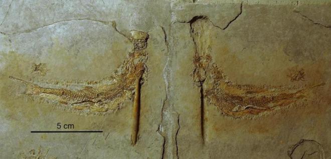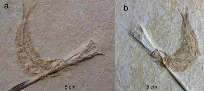 箭石的脑袋末端大概有10只触手,上面都带着小吸盆和钩子,抓水里的小鱼小虾、小甲壳类信手拈来,平时基本可以做到吃穿不愁。它的视力也不错,可以和近亲乌贼媲美,能敏锐地捕捉到猎物和危险信号,不过它的内壳可比乌贼的结实多了,其中鞘最为坚硬耐保存,我们现在看到的箭石化石,大多都是它的鞘。而当时死亡的鱼类被称为是Tharsis,是远古时代索伦霍芬生物群中很常见的一种小鱼,成年的Tharsis体型十分惊人,可达27厘米左右,可被箭石“钉死”的大多是幼崽,体长还不到10厘米。Tharsis早就灭绝了,虽然没有人亲眼见过活物,但科学家通过研究它的化石,也大致摸清了它的习性。