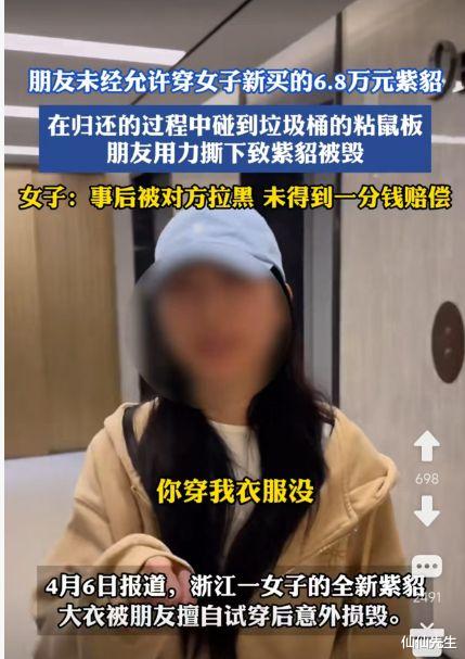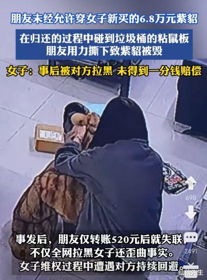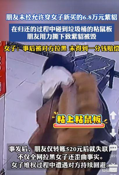 然而闺蜜竟然毫不犹豫,直接硬将粘老鼠板从大衣上扯下,同时扯下非常大一块的紫貂毛,导致内衬变形,几乎算是毁掉了整件大衣,而整个过程全被女子家中的监控拍录到。