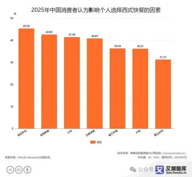 前有狼,后有虎,华莱士的低价优势,正在被全面瓦解。更严峻的是,消费者的需求已经变了。艾媒咨询的数据显示,2025年,食品安全以45.36%的占比,成为消费者选择西式快餐的首要因素。曾经让华莱士出圈的10元3个汉堡的极致性价比,吸引力正在持续下降;而「喷射战士」的标签,成了它最难撕掉的负资产,持续消耗着消费者的信任。
