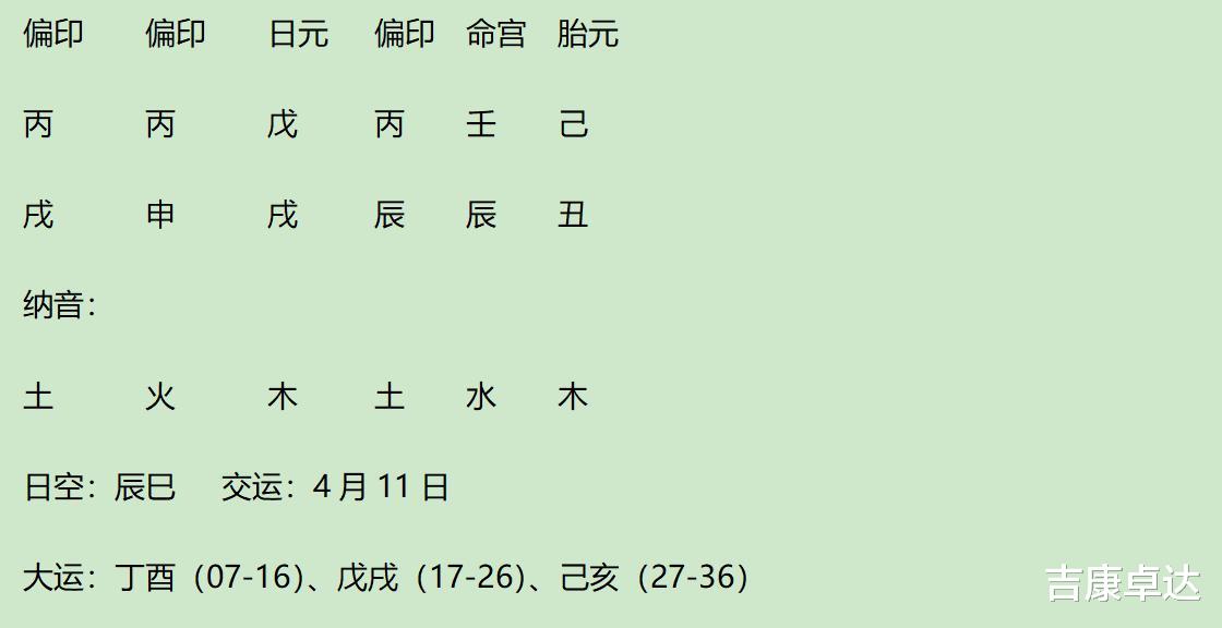 日主戊土,地支得戌比、戌比(被辰冲)、辰比(逢戌冲)、辰比(被辰刑)、丑劫,2丙偏印生、己劫助,身强。