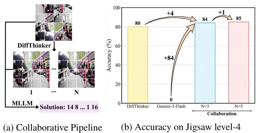 协同推理(Collaborative Reasoning)DiffThinker 还可以与 MLLM 合作。它生成多个候选视觉解,再由 MLLM 进行逻辑验证。实验显示,这种「DiffThinker 生成 + MLLM 验证」的组合,性能实现「1+12」,超越了任何单一模型。