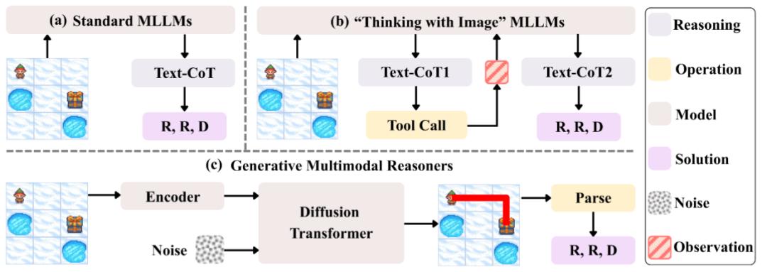 在多模态大模型(MLLMs)领域,思维链(CoT)一直被视为提升推理能力的核心技术。然而,面对复杂的长程、视觉中心任务,这种基于文本生成的推理方式正面临瓶颈:文本难以精确追踪视觉信息的变化。形象地说,模型不知道自己想到哪一步了,对应图像是什么状态。