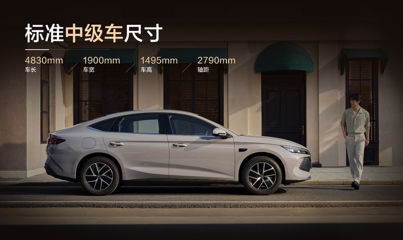 整车以全新一代龙颜美学塑形,车身比例舒展大气,标准中级车,身长4830mm,轴距2790mm。修长的车侧腰线将优雅与力量兼具地呈现出来。贯穿式尾灯在江南的水雾与灯影中显得格外纯粹,车辆低风阻车身的设计更在试驾过程中让能效表现进一步得到验证。