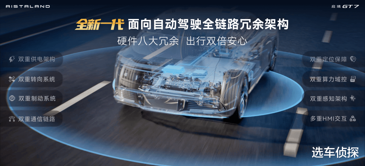 启境GT7拥有同级唯一面向自动驾驶的全链路冗余架构,涵盖感知、计算、供电、转向、制动、通讯、定位及HMI交互八大核心系统的双重冗余设计。即便在极端小概率的硬件失效情况下,车辆仍具备自动靠边停车的Plan B。得益于前瞻硬件预埋,让启境GT7拥有了持续进化能力。待相关法规体系完善,即可通过OTA软件升级,解锁更高阶智驾体验,真正做到常用常新。