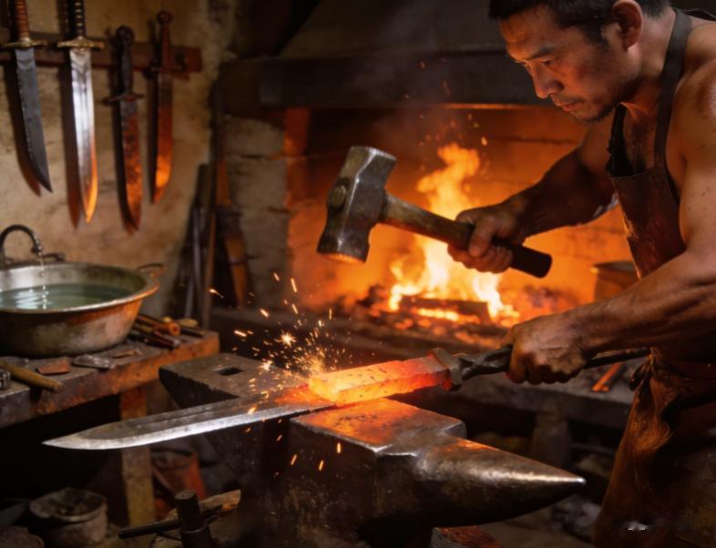 最关键的是“百炼钢”技术。简单说,就是反复折叠锻打:把钢坯烧红、捶打、再烧红、再捶打,少则几十次,多则上百次。