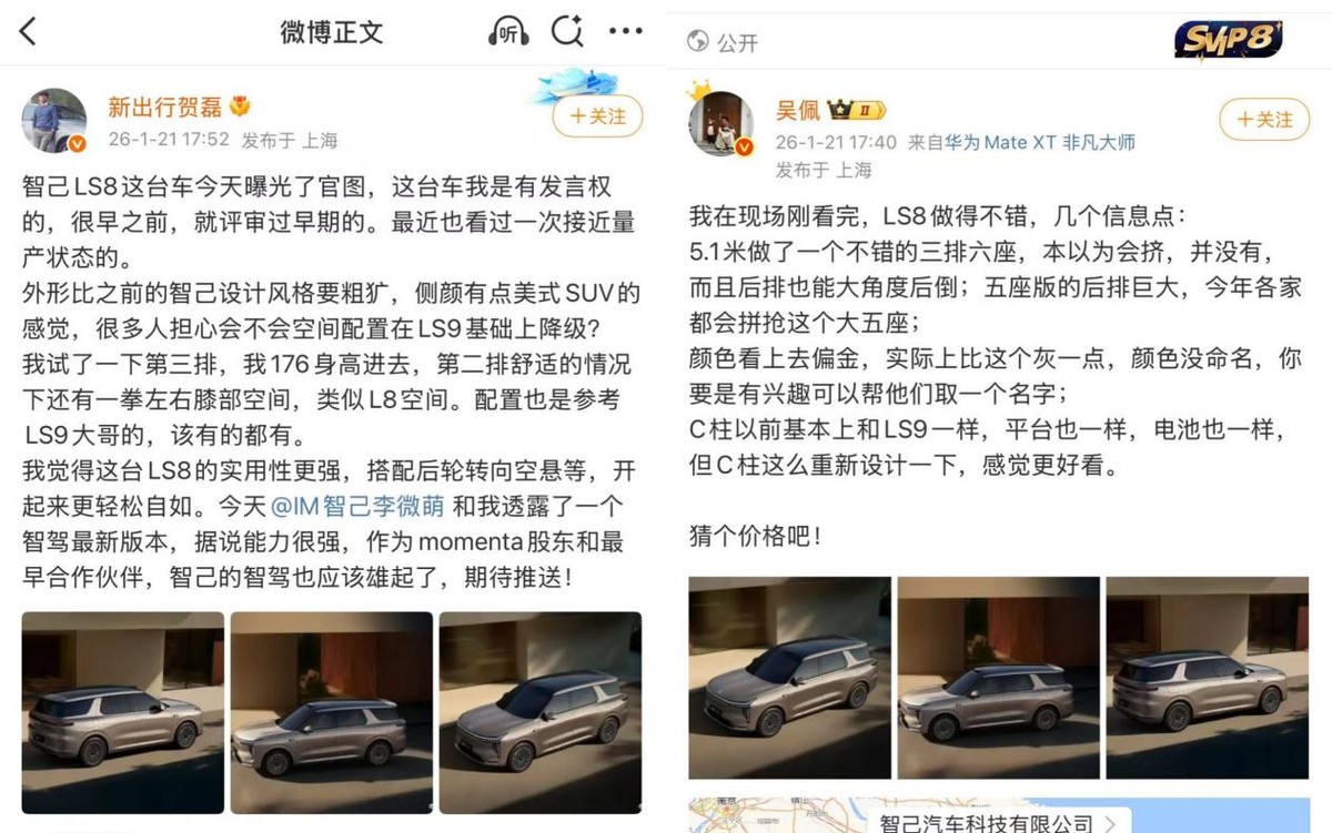 2026年1月刚开局,新能源市场各大车企扎堆放出新车。就在今天,智己汽车正式发布全新大型SUV智己LS8官图。作为智己“6789”SUV产品矩阵的关键补位车型,智己LS8凭借直逼揽胜运动的强大气场,叠加智己一贯秉持的硬核产品力,无疑将成为大型增程SUV市场中极具竞争力的一员猛将。本文将结合官图细节、申报信息及最新行业爆料,解读一下智己LS8核心亮点,让大家清晰读懂这台“陆家嘴揽运”的实力。
