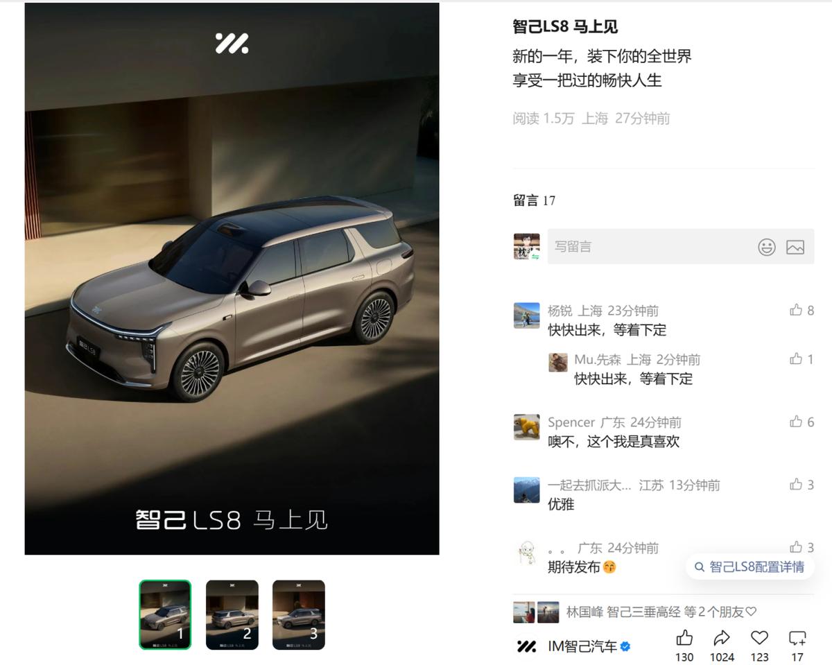 智己官方号发布LS8挂图配文“新的一年,装下你的全世界,享受一把过的畅快人生”,我们大胆猜测,智己LS8不仅有“陆家嘴揽运”的颜值,更会延续品牌“好开+能装大空间”的核心优势。