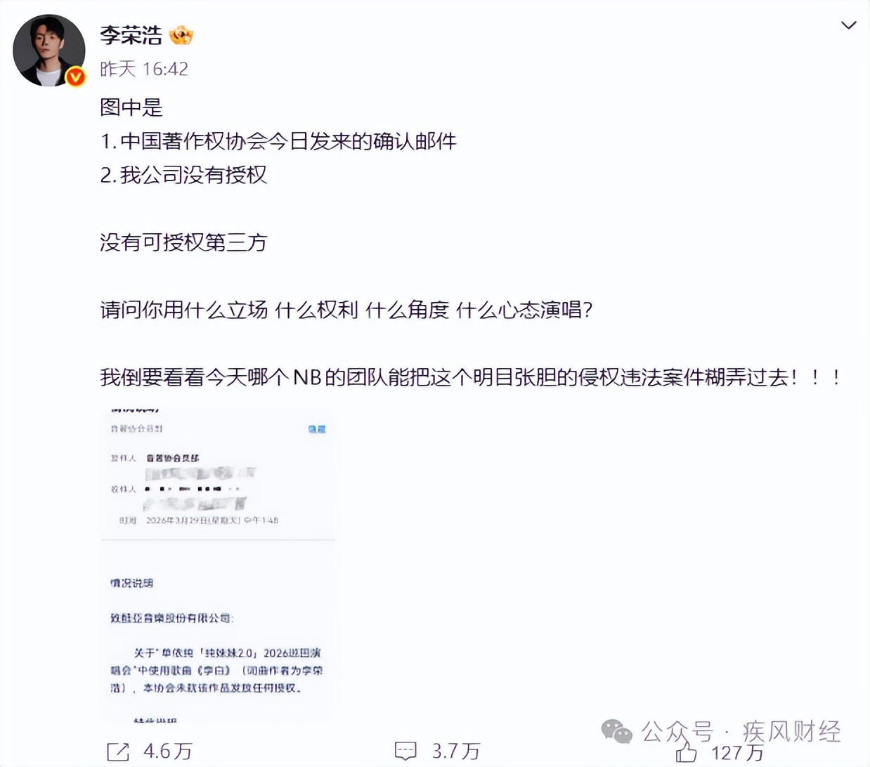 看到单依纯敷衍的回应后,李荣浩几乎在同一时间段再次发文。他直接晒出音著协的确认邮件作为铁证,连发四问:“请问你用什么立场?什么权利?什么角度?什么心态演唱?”并放话:“我倒要看看今天哪个NB的团队能把这个明目张胆的侵权违法案件糊弄过去!!!”