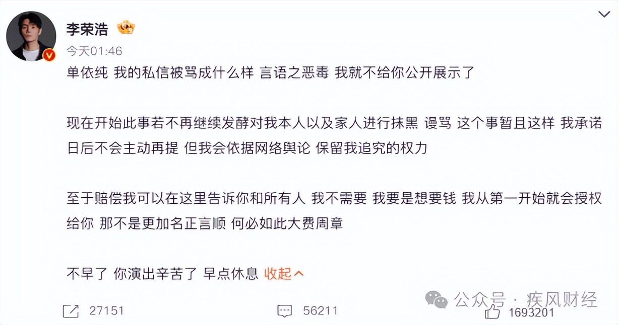 仅仅38分钟后,凌晨1点46分,李荣浩迅速回应。但他的回应重点既不是版权也不是赔偿,而是直接亮出了自己承受的网络暴力:“我的私信被骂成什么样,言语之恶毒,我就不给你公开展示了。”他给出明确警告:“现在开始,此事若不再继续发酵对我本人以及家人进行抹黑、谩骂,这个事暂且这样,我承诺日后不会主动再提。但我会依据网络舆论,保留我追究的权力。”至于赔偿,他态度坚决:“我不需要。我要是想要钱,我从第一开始就会授权给你。”