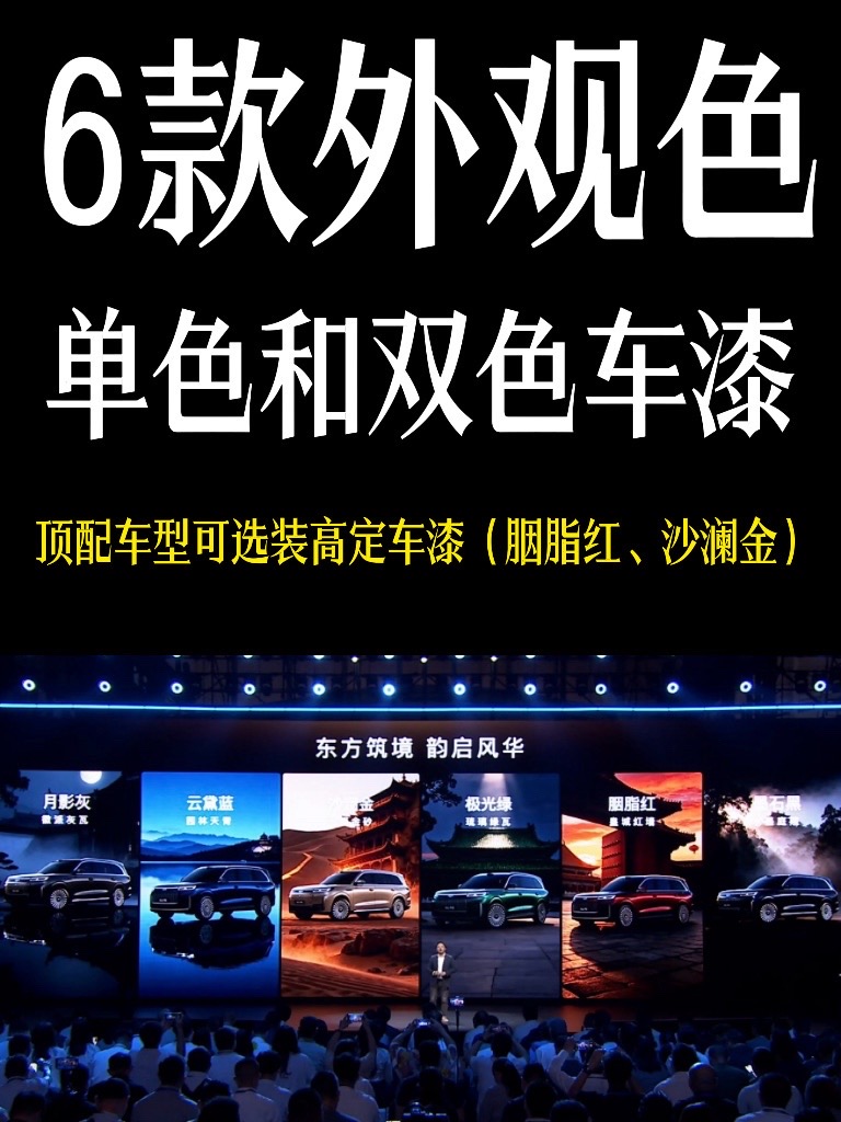 新车一共给了提供9种外观颜色,包括6种单色涂装和3种双色涂装,极光绿,墨石黑,云黛蓝,沙澜金,胭脂红,月影灰;内饰三款颜色,米色、黑色/棕色和棕色。