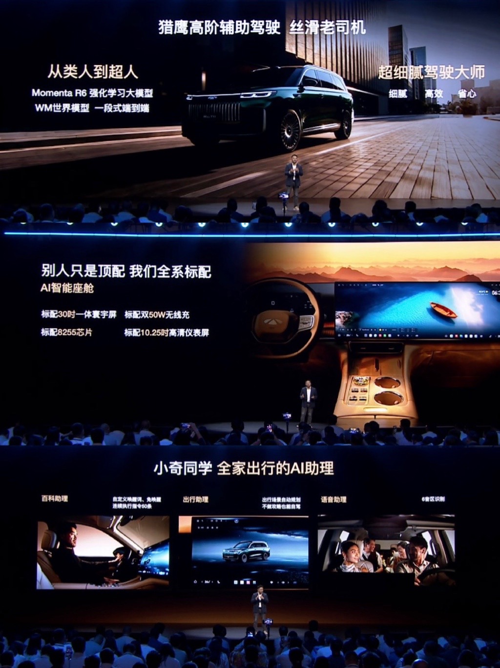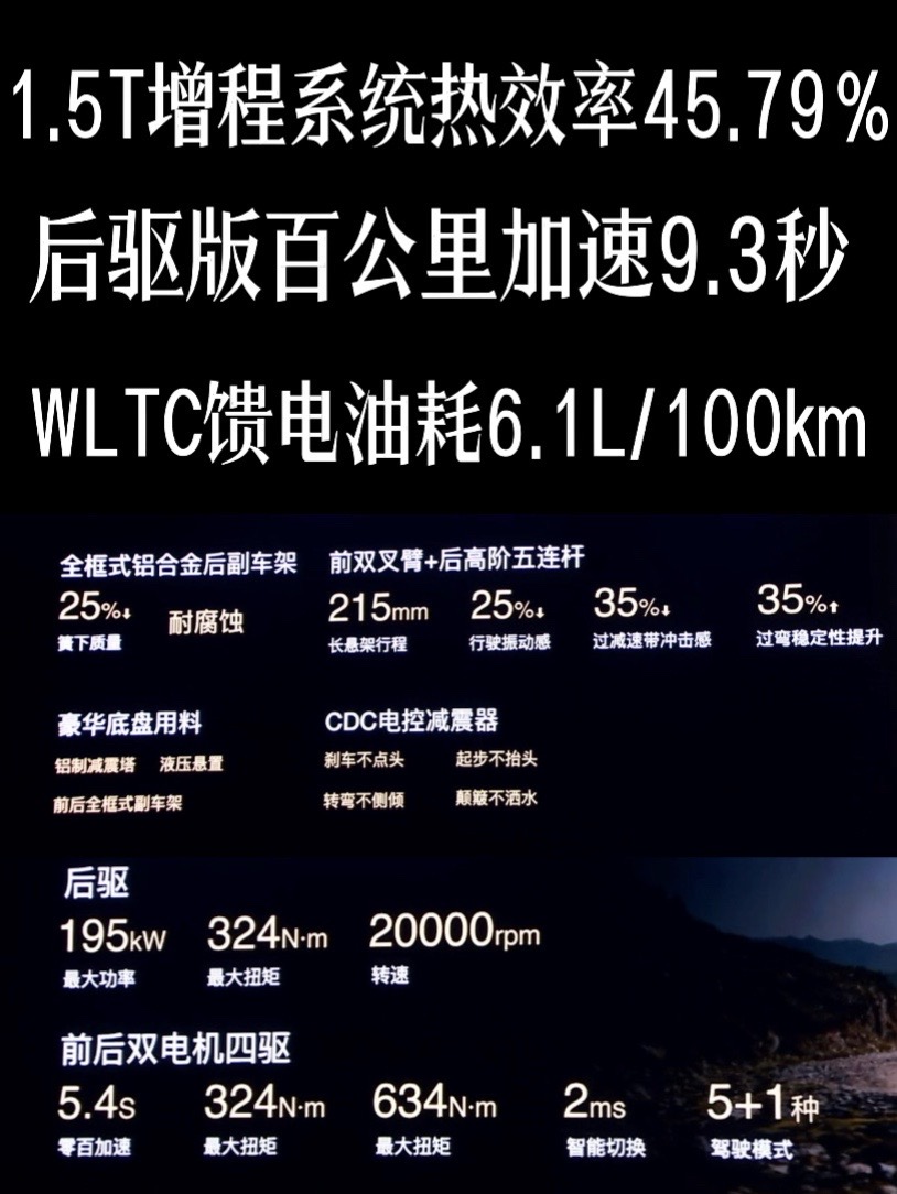 搭载高通8255芯片和Deepseek AI大模型,搭载1.5T增程器(最大功率115kW),提供单电机(195kW)和双电机版(345kW),零百加速进入5秒级。
