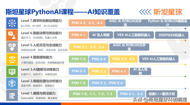 发布会上,联合创始人苏行洲老师提到,斯坦星球的AI课程设计,是基于AI知识学习模型与能力的七个层次,从编程与算法能力到跨学科创新应用能力,全面覆盖AI学习的各个阶段。