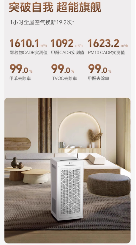 官方标注新颐 A8 的适用面积为 50-193㎡,颗粒物CADR 值(洁净空气量)达1610.1 m³/h,这个数据在同价位机型中堪称 “大空间王者”—— 对比普通净化器(多为 500-800m³/h CADR,适用面积≤100㎡),它的覆盖能力直接翻倍,完全能满足复式楼、大平层的需求。