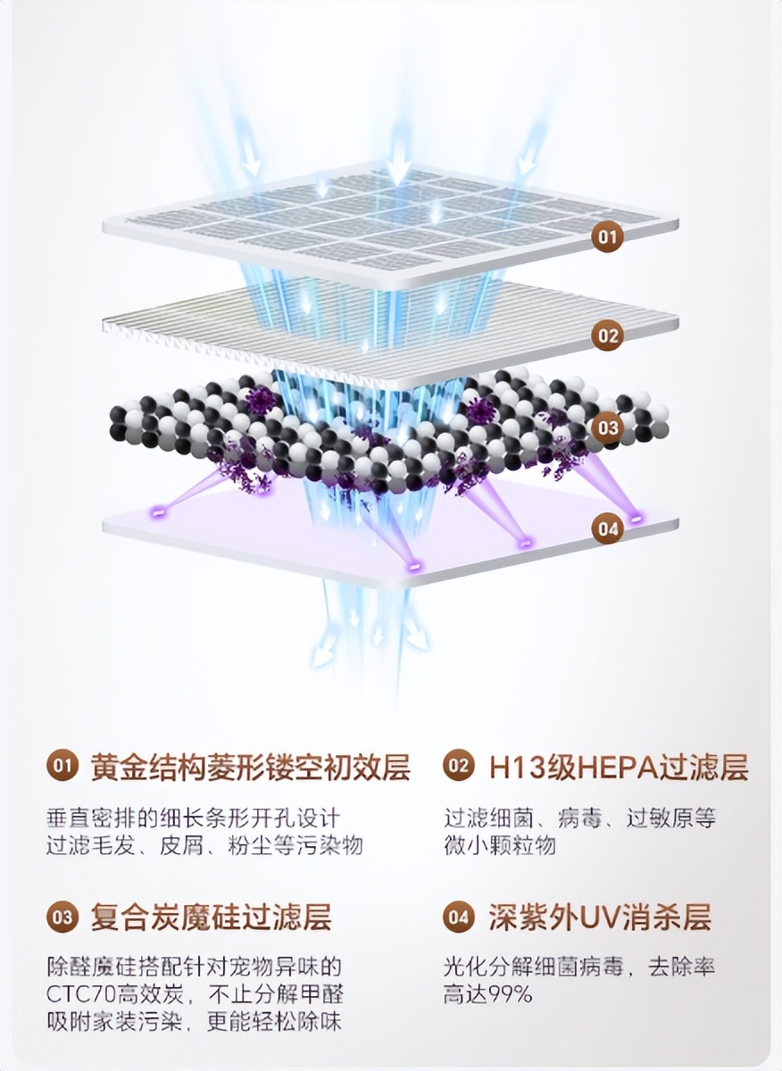 滤网寿命长,单台更省钱:H13级别复核除醛滤网,HEPA面积高达12.8㎡,按每天使用 8 小时算,可使用 12 -18个月左右,比两台普通净化器(每台滤网寿命 6 个月)省一半更换频率,单年滤网成本仅 300 元左右,比两台机器省 40%;