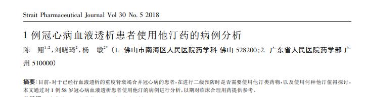 参考资料[1]陈翔.1例冠心病血液透析患者使用他汀药的病例分析[J].海峡药学,2018