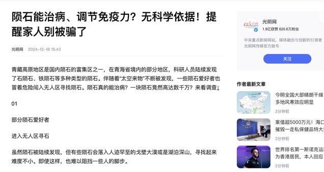 在2024年12月份的时候,就连光明网都曾经出过一篇文章辟谣,说陨石能治病,调节免疫力,没有任何的科学依据。