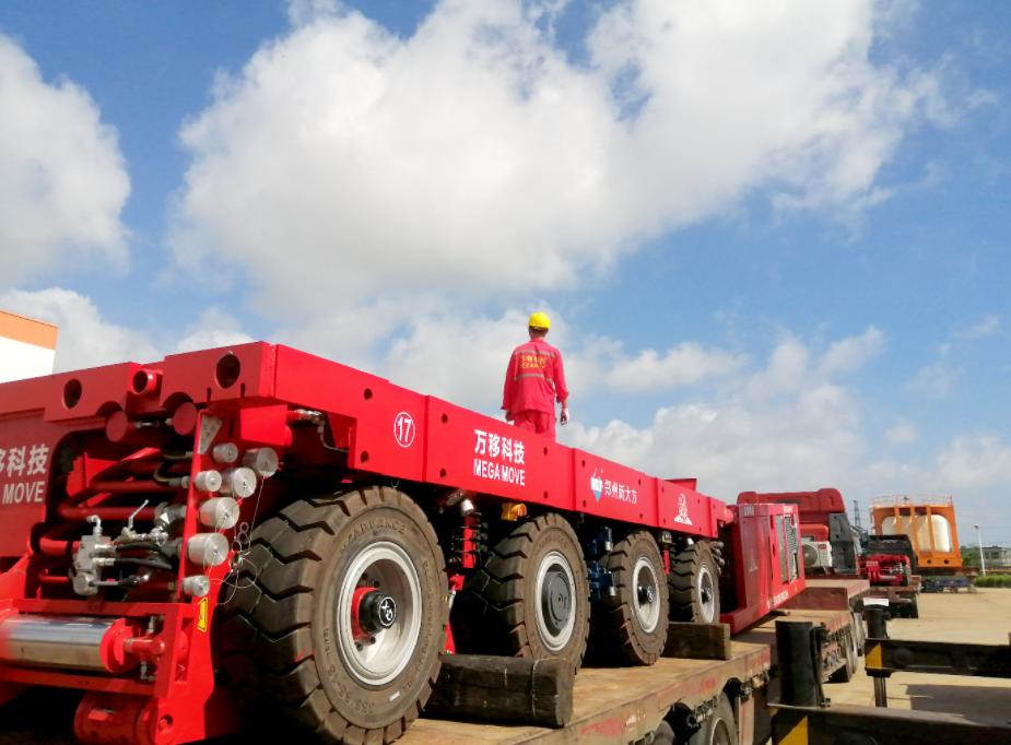 这样的庞然大物,必须上液压平板运输车,不管货物有多大,形状有多怪异,这种车都能运。它的平板是可以拼接的,按需组装,由液压驱动,每个轮子都可以独立转向,由计算机进行精准控制,具备自动调平功能。不要说运2000多吨的分离塔了,1000多个轮子可以运5万吨,航母分段船体也由它来短距离运输。