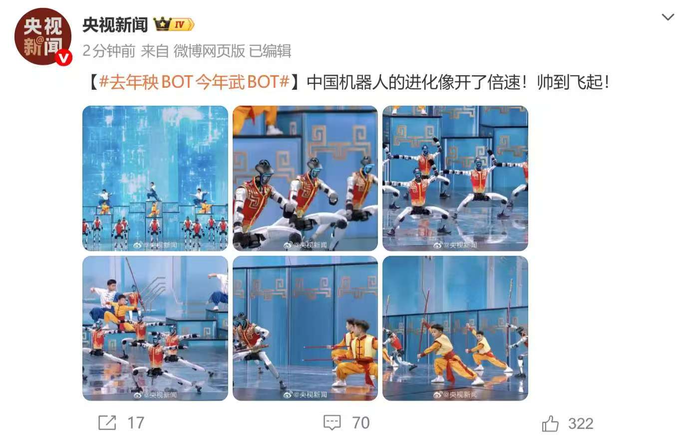 全场景覆盖,节目适配度拉满机器人表演贯穿主会场与两大分会场,实现全场景渗透。魔法原子在宜宾分会场《立上游》秀群控,主会场《智造未来》与艺人伴舞;宇树科技现身《武BOT》与义乌分会场,松延动力登陆小品《奶奶的最爱》,银河通用则在微电影中趣味出镜。