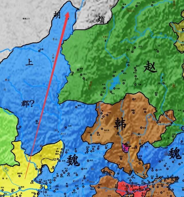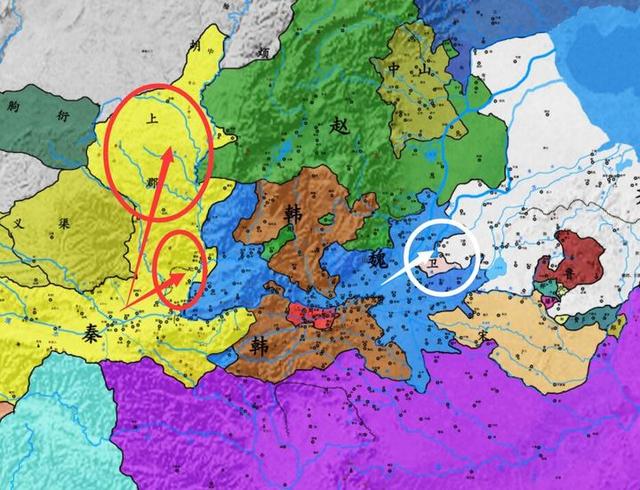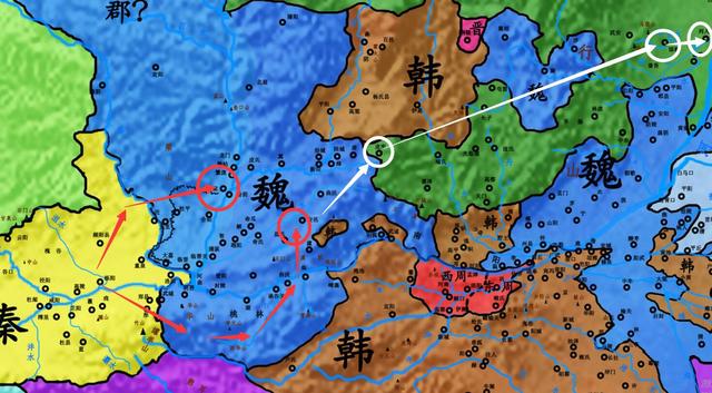 红箭头为秦军对河西、上郡的攻势,红圈即河西、上郡的大致范围,上述两郡在当时相对较穷,不过战略意义重大;