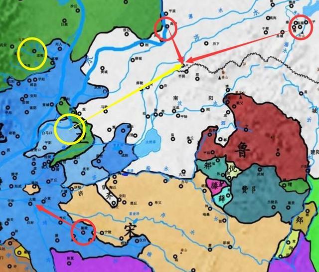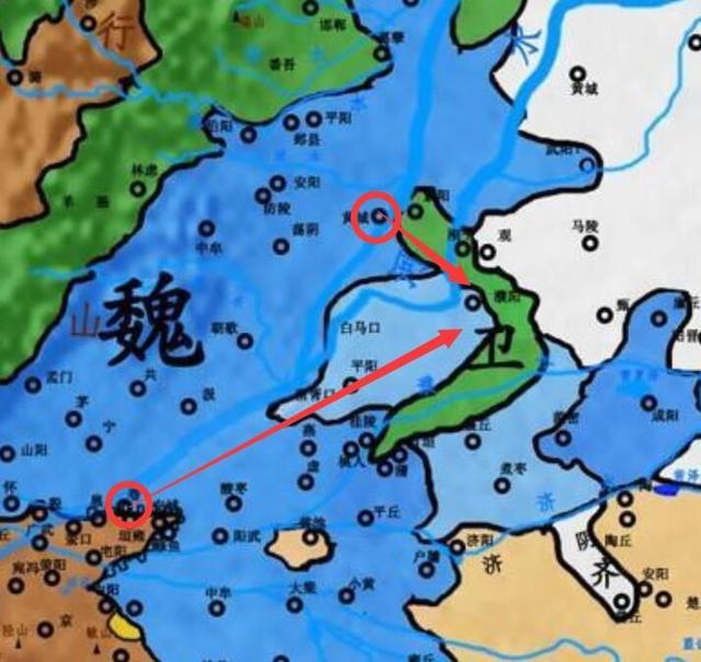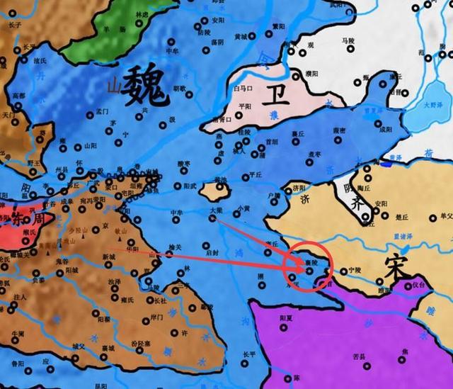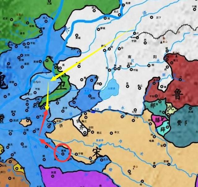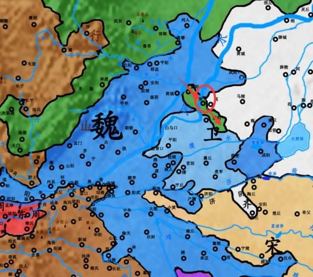 白箭头为魏军在富庶的泗上地区的扩张,白圈为大致范围,其中魏国曾经一度把卫国削至仅存濮阳。