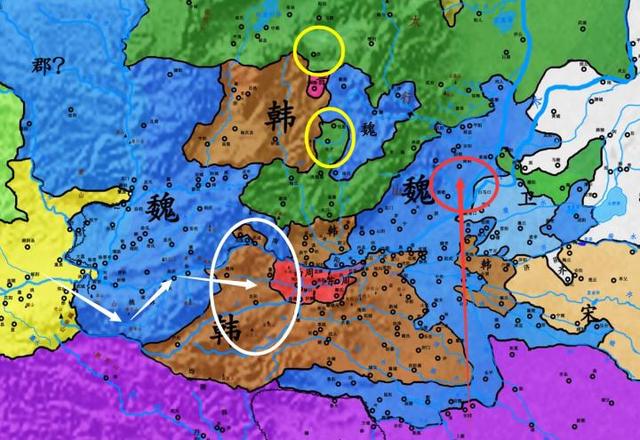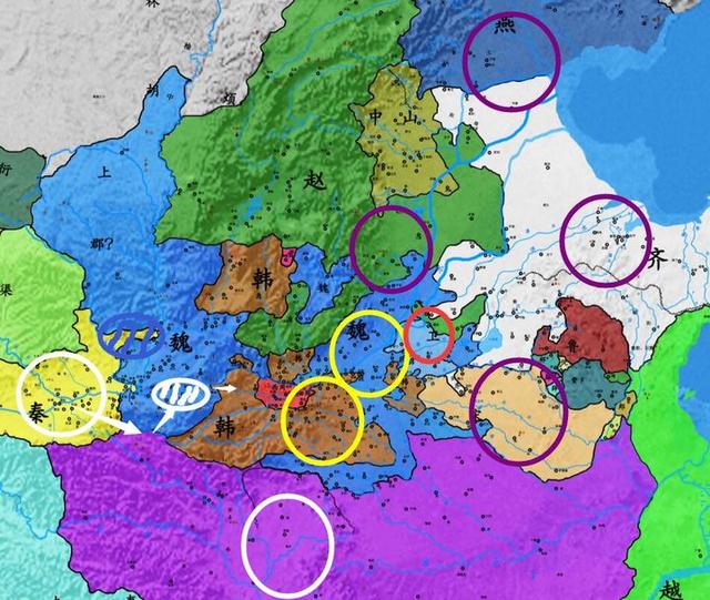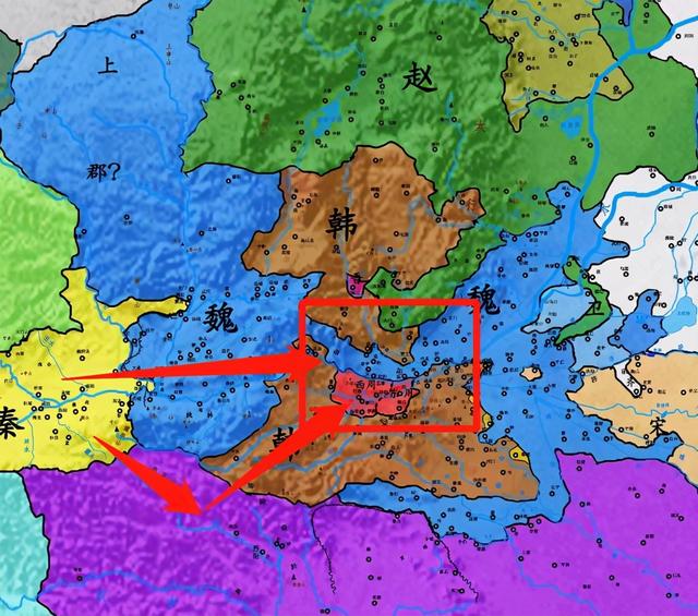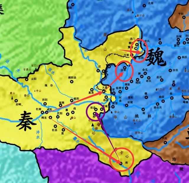 紫箭头为商鞅叛乱的大致进攻路线,紫圈即商鞅战败的郑及彤一带。