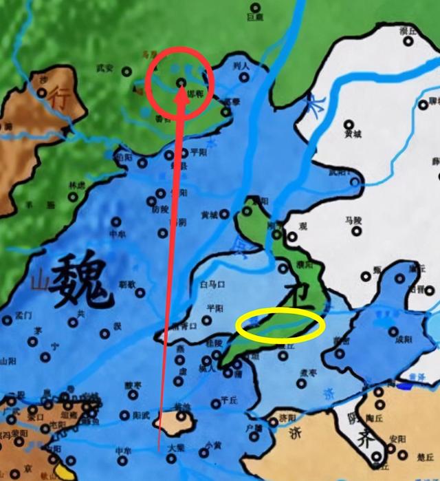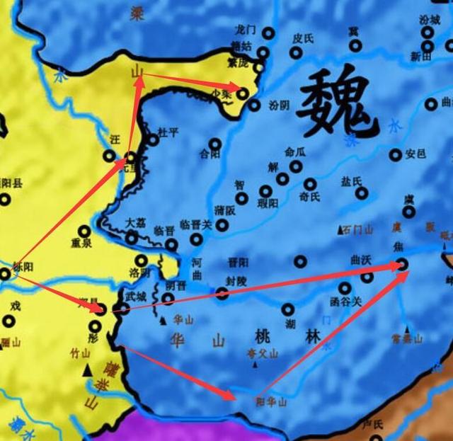 如图所示,红箭头为魏军攻势,红圈即定阳的大致位置。在魏军得手后,秦国在固阳地区的军事行动自然会无以为继。