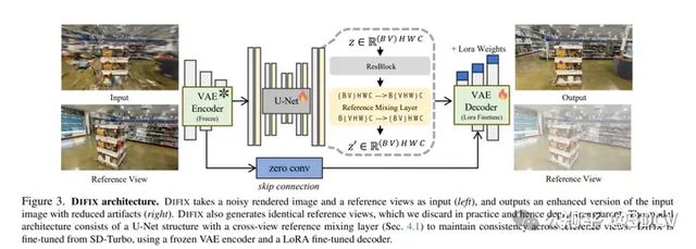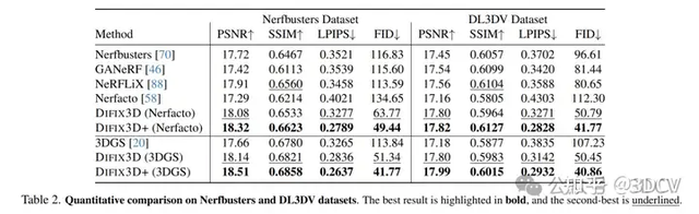 我们展示了DiFIX3D+在野外场景(顶部)和驾驶场景(底部)上的表现。最近的新视图合成方法在稀疏输入设置或渲染远离输入相机姿态的视图时存在困难。DiFIX从2D生成模型的先验中提炼,以提高重建质量,并在推理时间进一步充当神经渲染器,以减轻剩余的不一致性。值得注意的是,相同的模型可以有效纠正NeRF和3DGS的伪影。