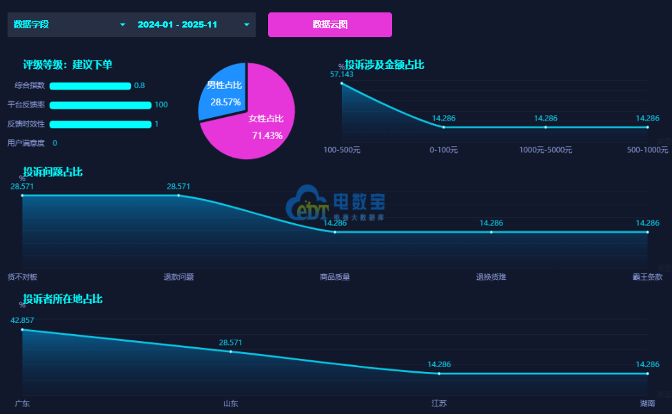 2025年至今,“电诉宝”受理投诉中涉及的数字零售领域中综合电商用户有效投诉显示(依据投诉量排行),“义乌购”排名第22位。最新评级为“建议下单”。除此之外,其他被投诉的类似平台还有:拼多多、抖音电商、淘宝、京东、快手、天猫、小红书、唯品会、阿里巴巴、微信视频号、苏宁易购、得物、微信小程序购物平台、交易猫、哔哩购、蘑菇街、淘特、网易、二三良作、小芒、卷皮、小象优品、1号店、中国移动移动商城、必要、大槐树、返利网、人人租。
