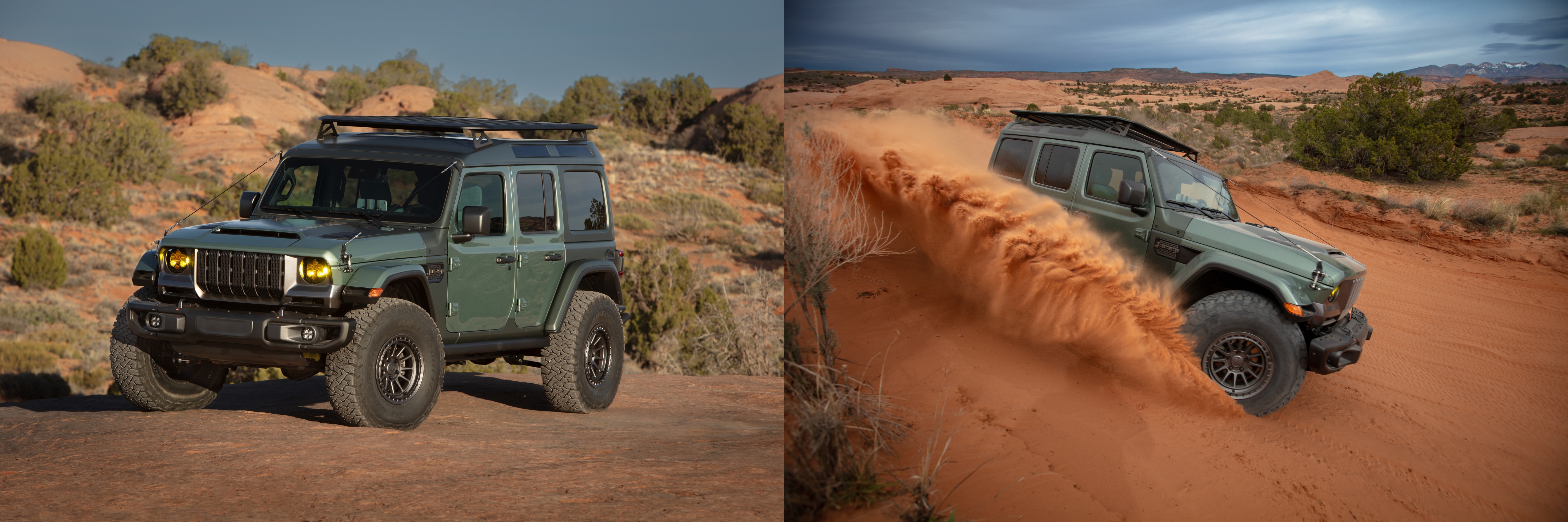 基于Wrangler Unlimited Rubicon,搭载6.4升392 HEMI V8发动机,输出470马力。设计哲学为“有目的、无冗余”:车顶升高4英寸,配备定制天窗与整合式行李架;前后钢制保险杠整合车载充气系统;中控台设有专用越野导航大屏。军绿色涂装致敬品牌军事血统,地板可直接水冲。这是一台专为长途穿越而生的终极Wrangler。